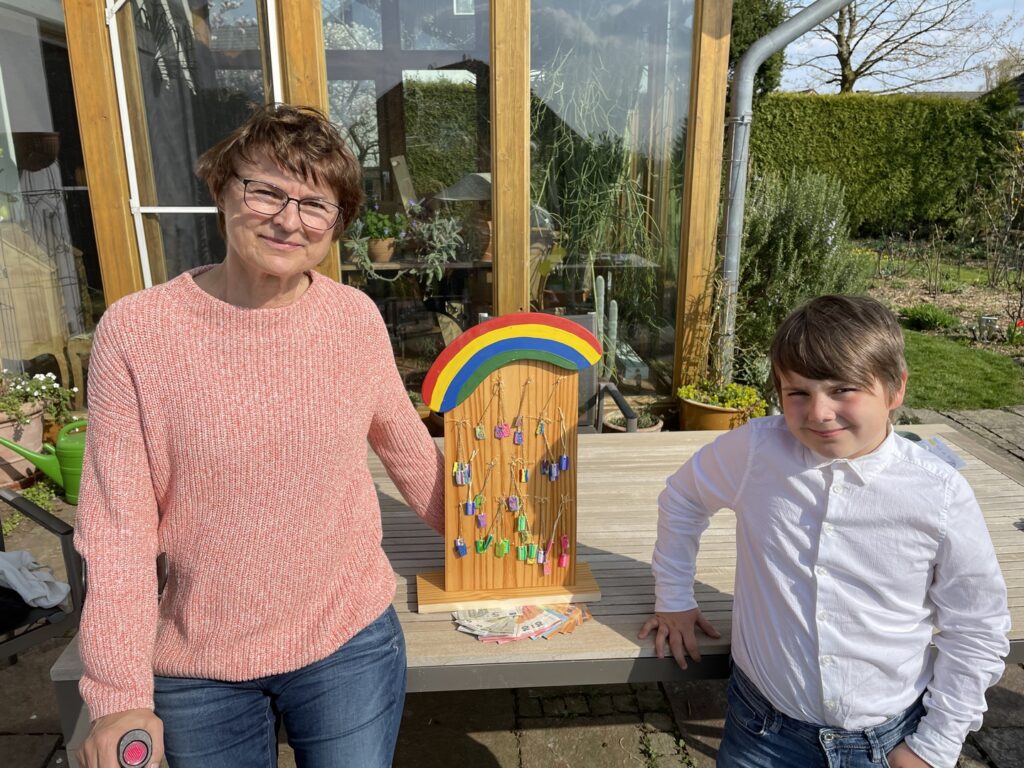 Begleitet von seiner Mutter übergab Frodo strahlend die 500 € an Angela Kaiser und äußerte die Hoffnung, mit seinen Schlüsselanhängern weitere Spenden